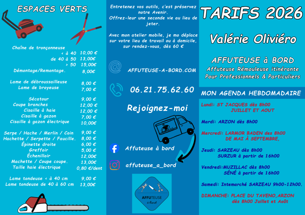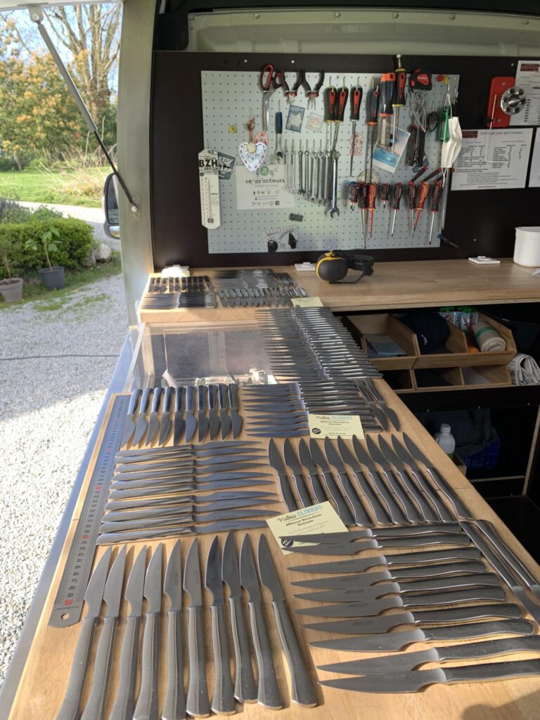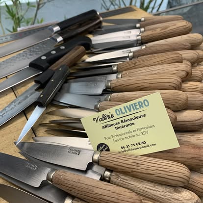 Je suis Valérie Oliviéro, Sarzeautine et je vous propose d’affûter vos couteaux, outils de jardin, ciseaux, etc…. à Bord de mon atelier itinérant sur la presqu’île de Rhuys et les alentours du Morbihan (56)