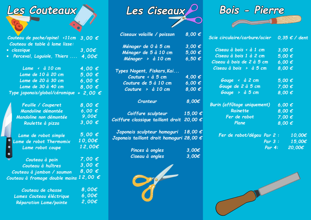 Tarifs sur devis pour vos outils ou lames particulières (bêche, outils pédicures…)